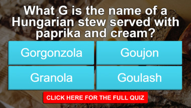 If you can answer "What verb means pouring liquid through a sieve to remove impurities?" and maybe even "What G is the name of a Hungarian stew served with paprika and cream?" there is a good chance that you're going to beat the average score of 6/10 in this trivia quiz