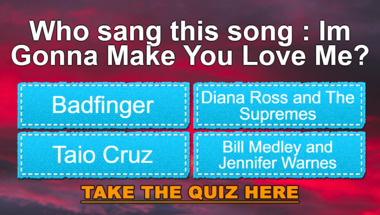 4/10 is the score to beat in this Love songs quiz to put yourself over the average quiz taker. But you're probably going to be able to answer questions "Who sang this song : "I'm Gonna Make You Love Me"?" and "Who sang this song : "So Sad (To Watch Good Love Go Bad)"?" easy!