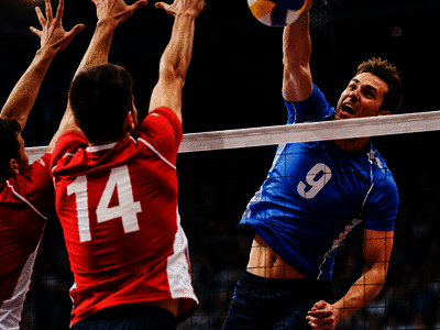 In which sport do you perform a slam, block, and spike?