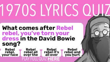 In this fun trivia quiz we're going to ask questions like "Crystal Gayle sang "Tell me no secrets, tell me some lies, Give me no reasons, give m.." and "What comes after "Rebel rebel, you've torn your dress" in the David Bowie song?".